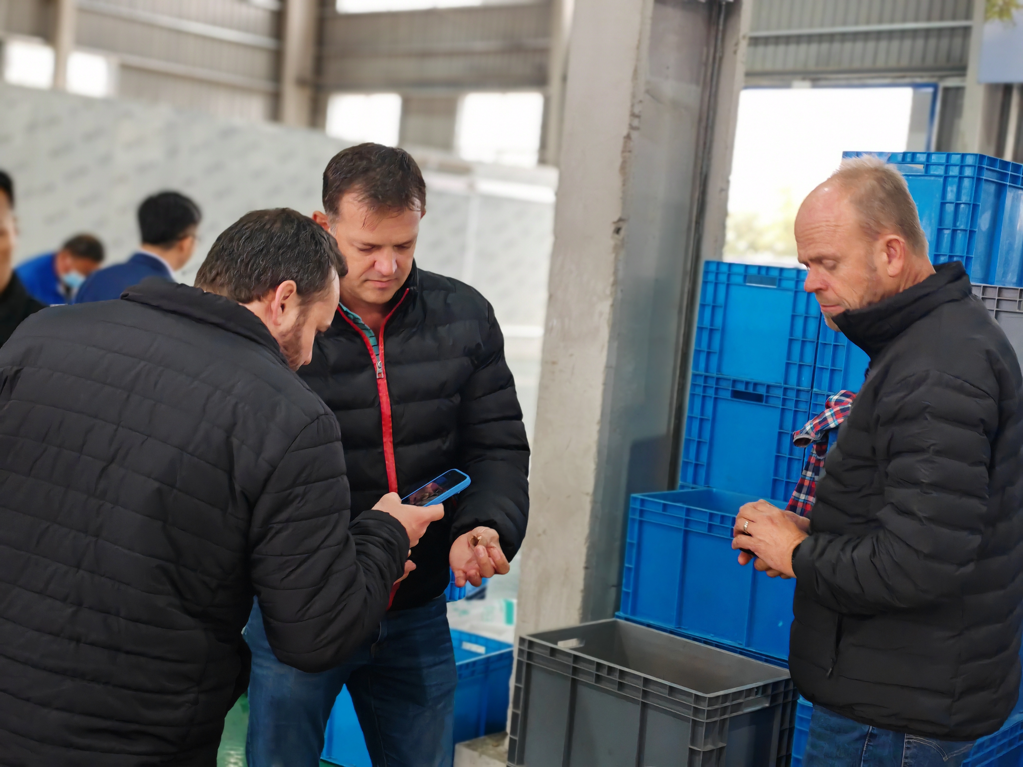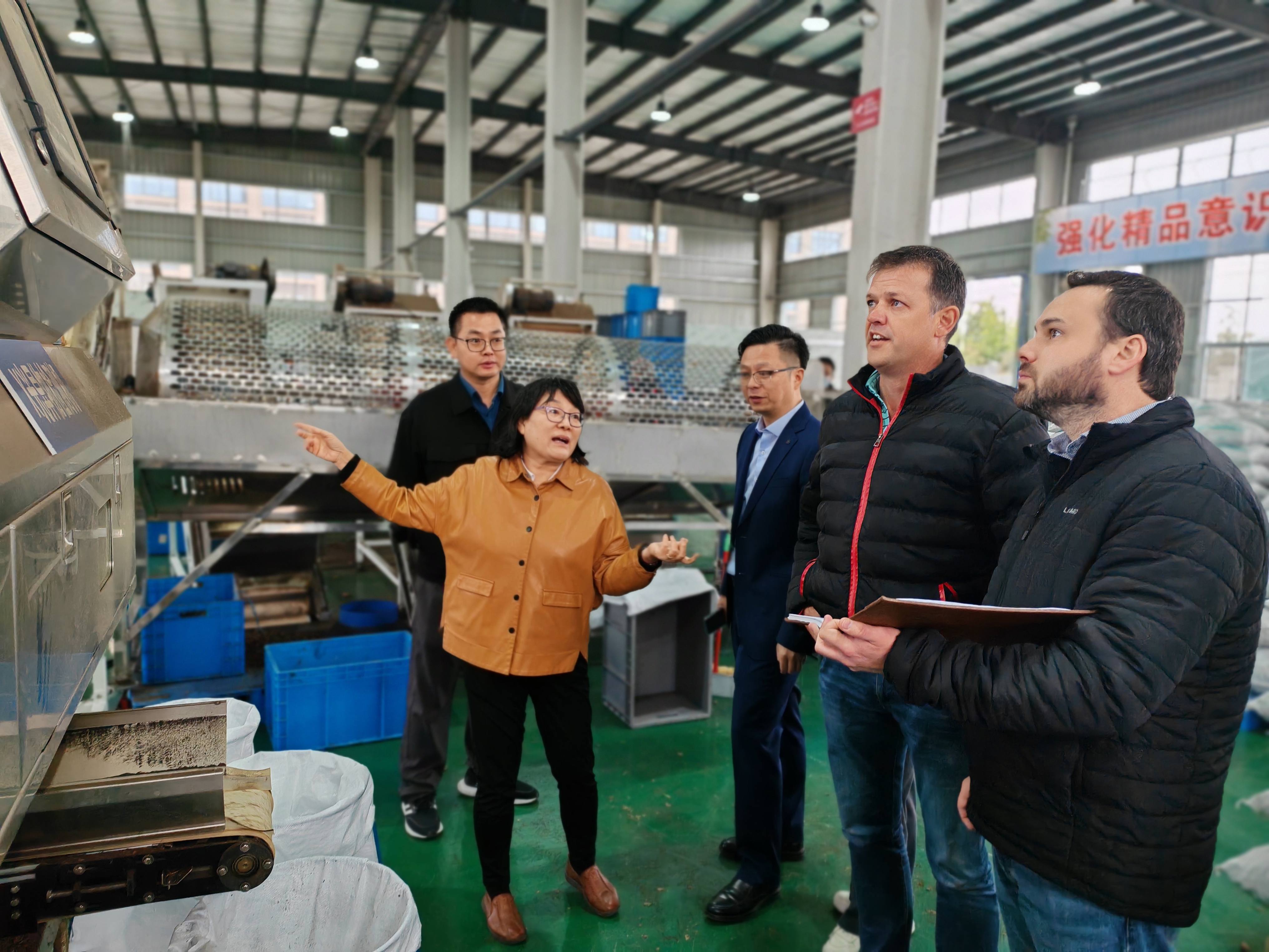 SAPPA与Bester人员首先介绍了南非的薄壳山核桃发展情况,随后参观了安徽佳烨的薄壳山核桃展厅、薄壳山核桃初加工生产线,详细了解了公司的种植技术、加工工艺以及市场销售情况。双方还就薄壳山核桃的品种特性、产量、病虫害防治及产品加工等关键技术进行了探讨交流。